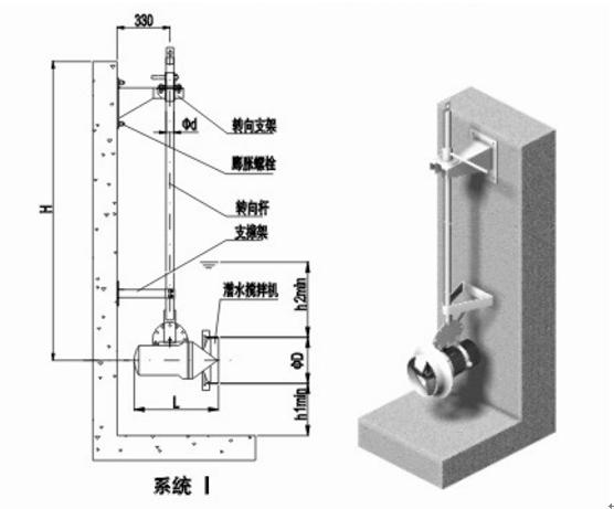 2、安裝系統(tǒng)I只適合用于池深≤3m,機(jī)型為QJB0.85/8和QJB1.5/6,可在水平方向和垂直方向調(diào)節(jié)角度;