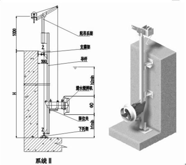 注:1、潛水?dāng)嚢铏C(jī)的專用安裝系統(tǒng),可在無需排除池中污水的情況下,能快速安裝和拆卸攪拌機(jī);