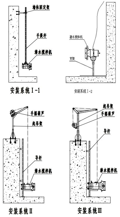 當池深H<4米時建議采用安裝系統(tǒng)一。潛水攪拌機的潛水深度可以根據(jù)需要進行垂直方向的調節(jié),而且在水平賣弄內可繞導桿旋轉的最大角度為正負60°起吊系統(tǒng)底座、支撐架和下托架與池的有關連接面均采用膨脹螺栓固定,無需預留孔。安裝系統(tǒng)二用導向鋼繩替代導桿,具有運輸方便,現(xiàn)場安裝簡單等特點。該系統(tǒng)從根本避免了由于運輸引起導桿彎曲的、變形從而影響正常使用的情況,并有效改善了池深過深情況下,由于導桿的安裝誤差而導致的無法正常起吊等現(xiàn)象。在有懸臂池頂?shù)陌惭b條件下更顯得操作方便可靠。